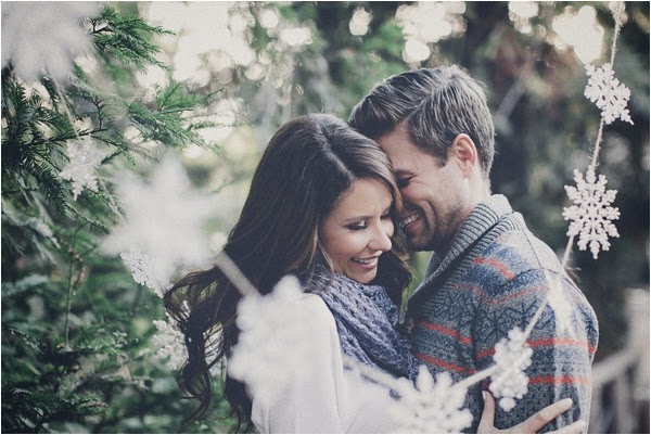 Gina and Ryan Photography describes this shoot as gorgeous and creative, and there's no denial, the shoot is whimsical and festive! If you want to create a magical, cozy and special ambiance for your holiday shoot, make sure to include plaid blankets to keep your beloved one and yourself warm, paper snowflake garlands, hot chocolate to sip when strolling hand in hand, and let's not forget to bring your favorite pets dressed all comfy and warm! They make the best companions and are always ready to celebrate magical holidays with you!